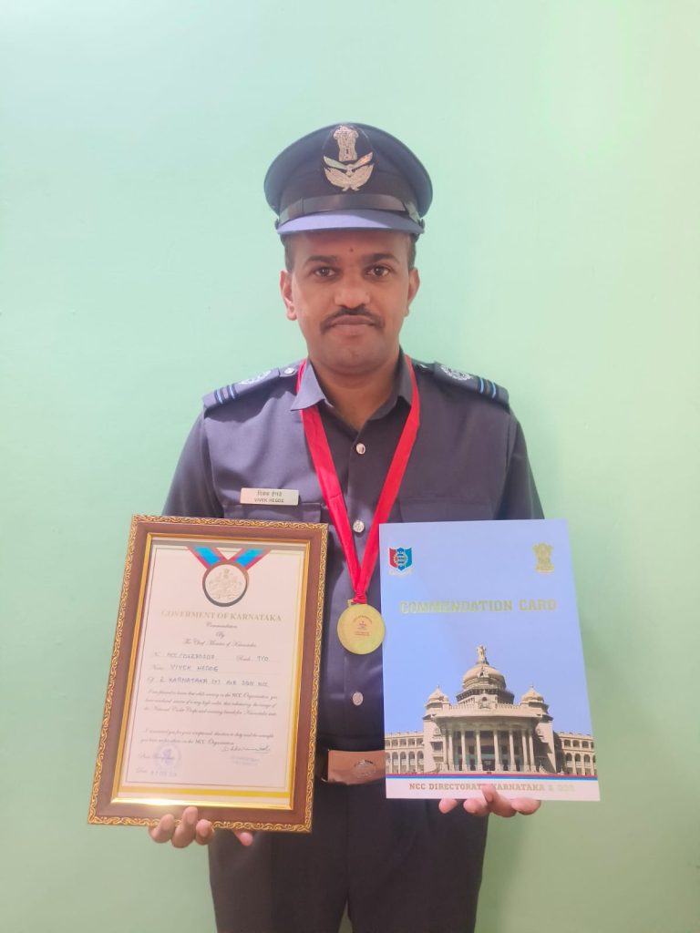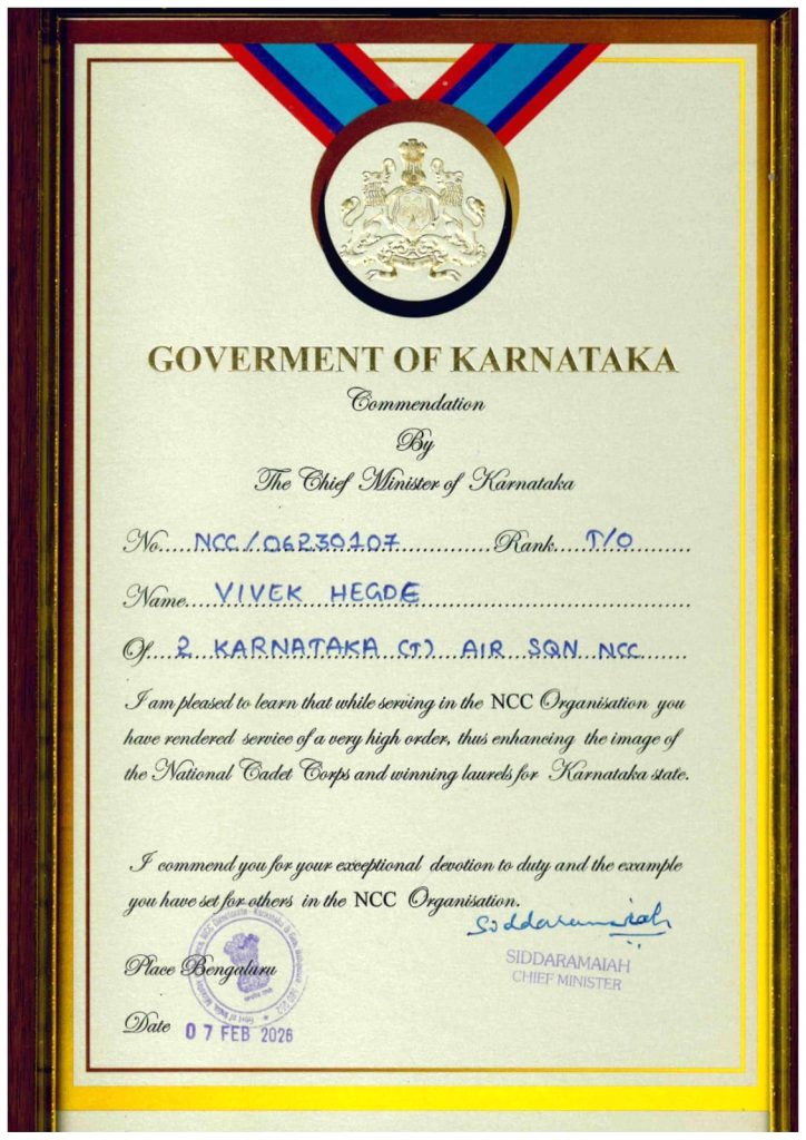 Our institution proudly congratulates Sri.Vivek Hegde on receiving a prestigious commendation from the *Government of Karnataka, conferred by Hon’ble Chief Minister **Siddaramaiah, for his distinguished service in the *National Cadet Corps.